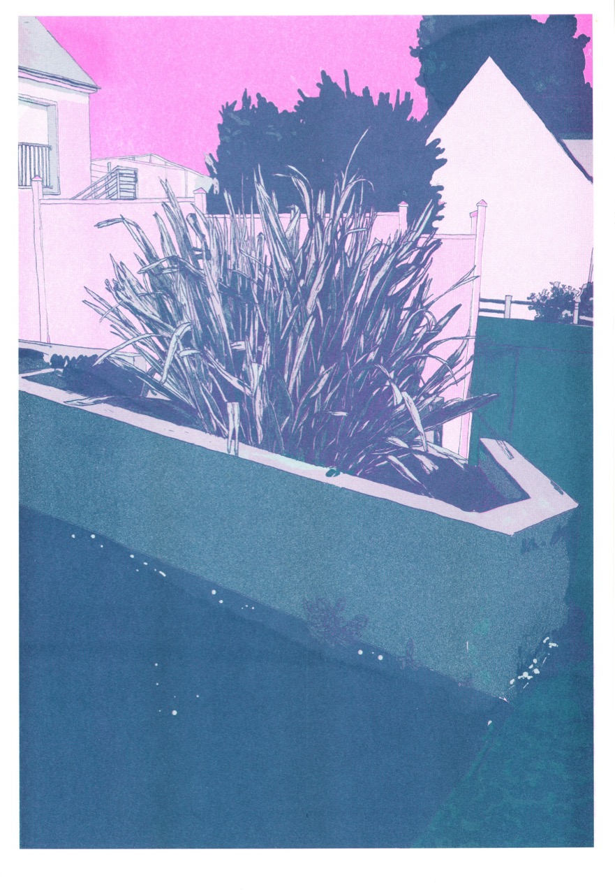 Imprimé en riso par Nico en rose fluo / teal